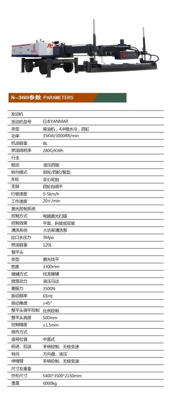伸缩臂S360铺注整平的水泥混凝土地面,相对于传统方法来说,使用该机更加的平整。其用于现代工业厂房、大型商场、货仓及其他大面积混凝土地面施工。伸缩臂S360摊铺整平的水泥混凝土地面,可满足其要求。
